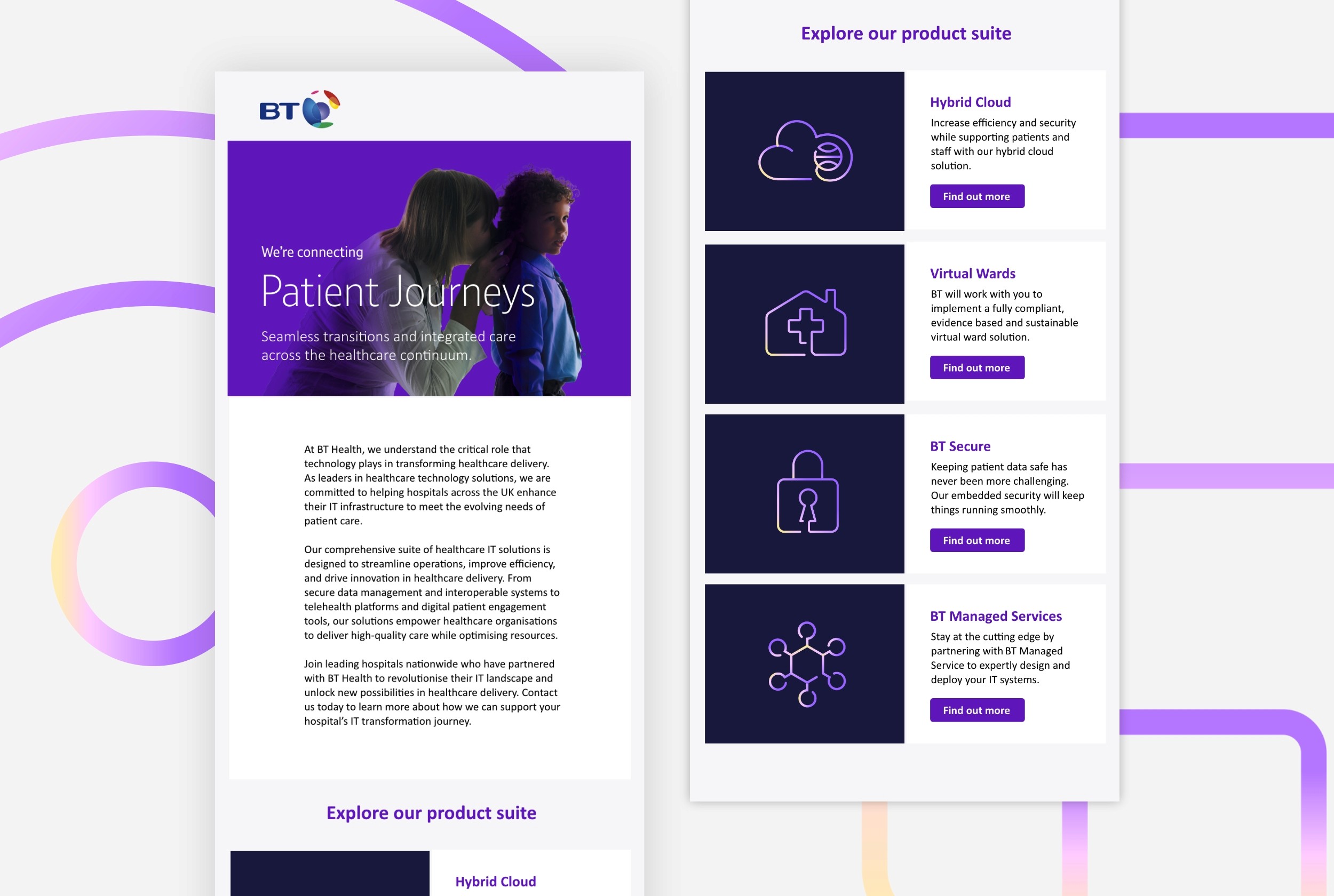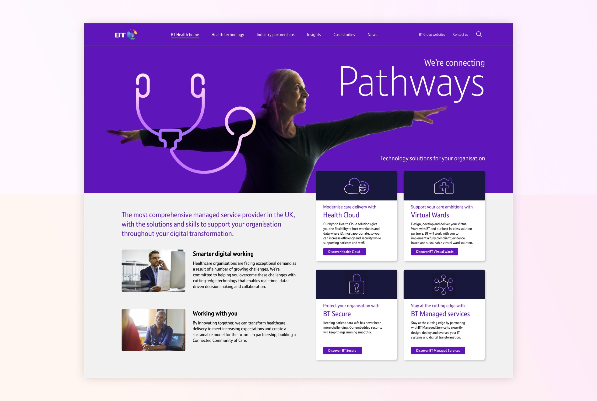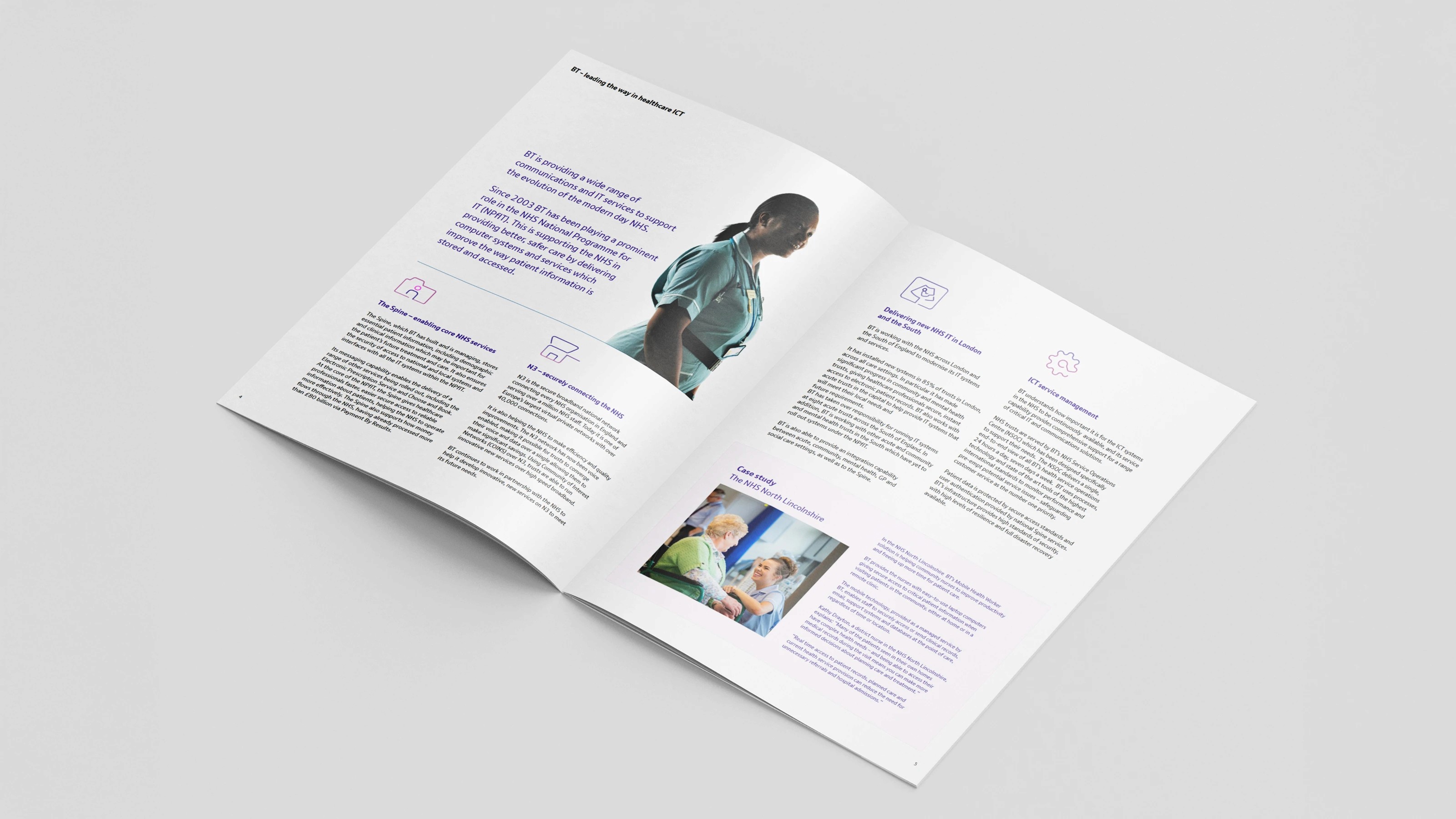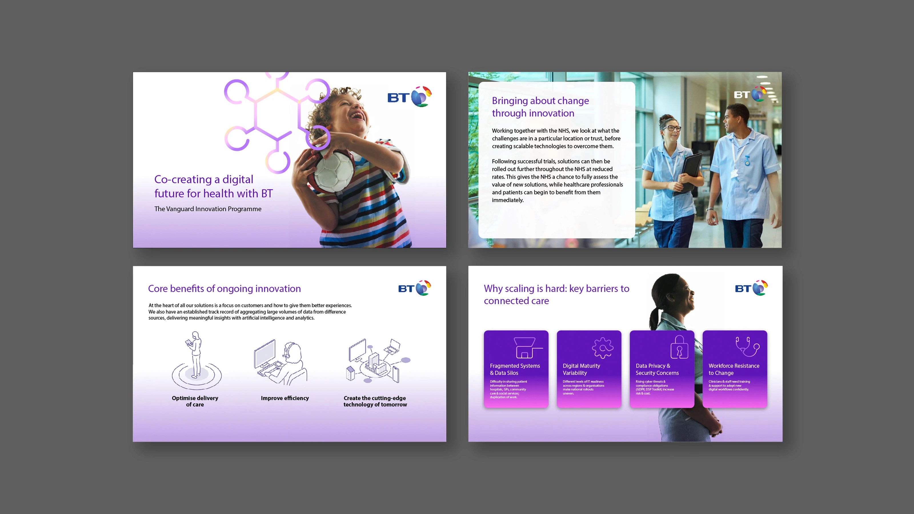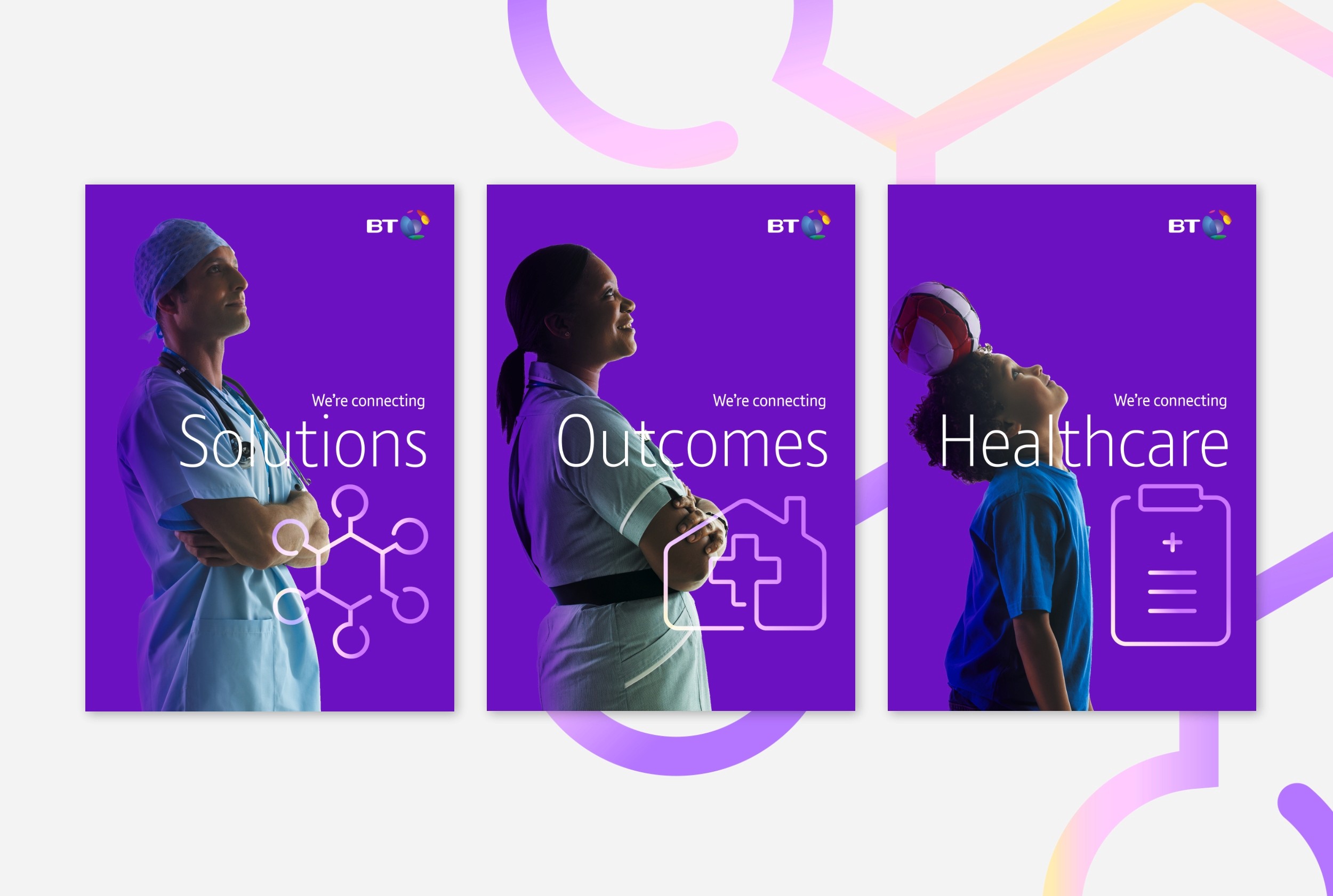 BT Health plays a vital role at the intersection of technology and care — providing the digital infrastructure that underpins the NHS and many private healthcare organisations across the UK. We developed a dedicated identity for this specialised division, reflecting both its connection to the wider BT brand and the trust, clarity, and authority essential in healthcare. The result is a distinctive yet cohesive expression of BT’s brand — one that empowers sales teams to engage confidently and authentically within the health sector.