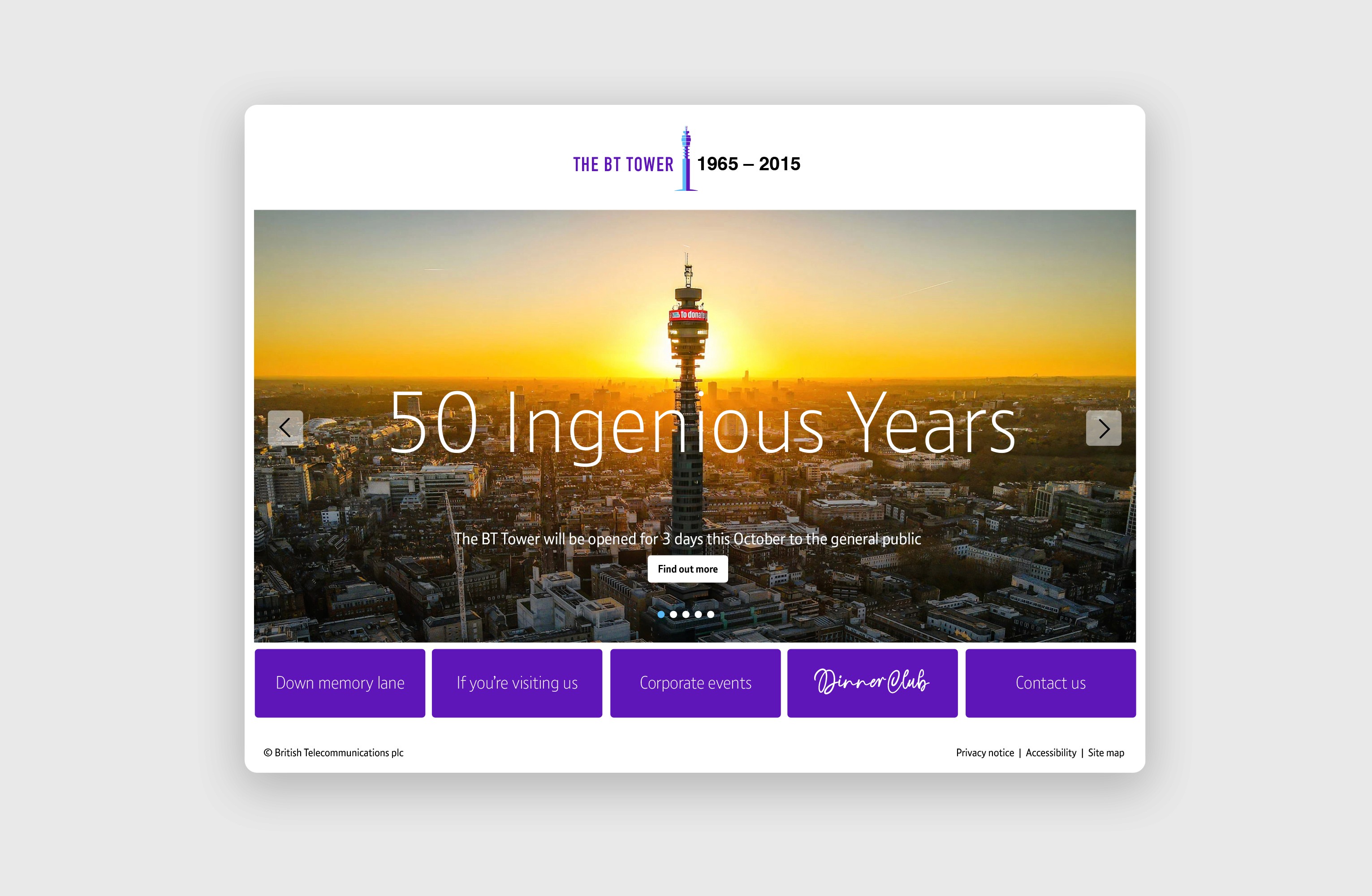 A striking icon of Cold War‑era brutalist architecture, the BT Tower has stood as a defining feature of London’s skyline for generations. To mark its 50th anniversary, we created an identity that honoured its remarkable legacy while looking to the future — repositioning the Tower as an exclusive destination for corporate events. The design captured both its architectural significance and its enduring role as a symbol of connection, innovation, and modern London.